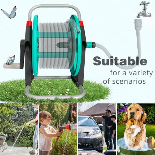 【Built-in Excellent 5/8"" Garden Hose 】65FT+6FT High Quality Garden Hose could be used in tough condition and offer super smooth User experience. Hold Up to 300PSI Water pressure. Longer inlet hose change possibility please customer service if that is needed. 【Free Lock and Automatic Rewind】Easy operate at far place use- The hose can be locked at desired length by pulling it. A short tug could unlock the hose to let it retract all the way back smoothly and nicely. The hose gudie at the front of Water hose reel can roll up the hose neatly without the trouble of kinking and 2 Non Snag Rollers that assists to reduce hose abrasion. 【9 Pattern Multi Function Sprayer No lead fitting material and confortable sleeve】The Hose Reel with 9 paterns nozzle could satisfy all kinds of water patten expectation. The connecmade with Healthy Aluminum Material to keep user away from Leaded copper. A connector sleeve with softer grip offer a confortable place durig hose pulling. 【Durable Construction】A