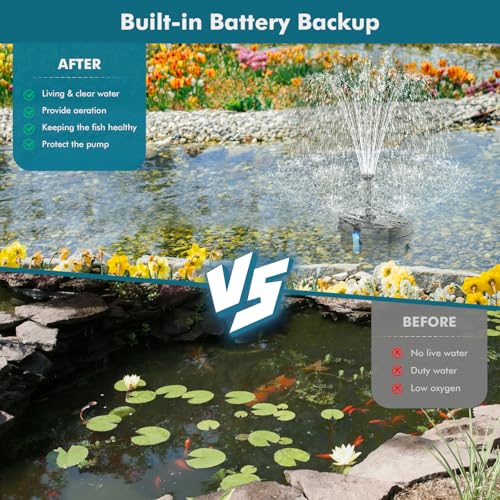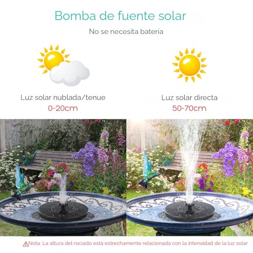 POPOSOAP 6W Solar Fountain Pump for bird bath solar powered water pump with 5 Easy Install Nozzle and 4FT water pipe for bird bath Pond Pool Garden Fish Tank Why Choose our solar fountain pump? 1. This solar fountain does not need any additional power supply very environmentally friendly. 2. Multiple water patterns: The fountain contains 5 different nozzles which will produce different spray shapes and spray patterns. 3. Very low failure rate: With a filter box and filter spong the water pump is not easy to be blocked. 4. Dry-run protection: The solar water pump has water shortage protection. If there is no water or the pump is blocked by debris it will automatically shut off so that it does not dry out and damage itself. Note 1. Make sure to place the solar panel in direct sunlight. 2. The solar pond pump needs to be cleaned regularly to prevent the water pump from being blocked by dirt. Package Included