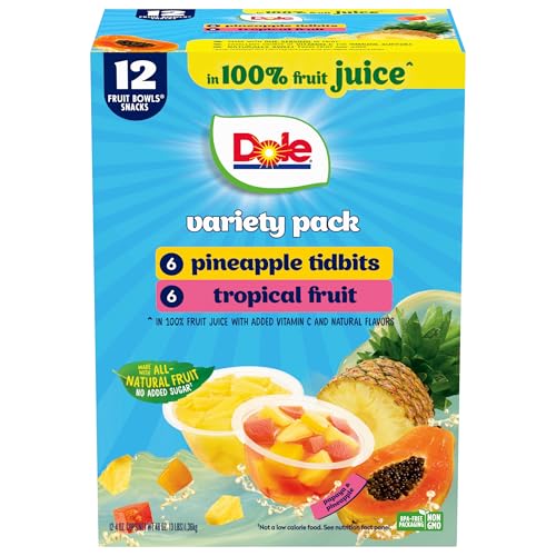 Indulge in the delicious taste of Dole's Fruit Bowls available in two flavors - Cherry Mixed Fruit and Diced Peaches both in 100% fruit juice. These convenient 4oz cups come in a pack of 12 making them an ideal choice for a healthy and refreshing snack for both kids and adults. Made with all-natural fruit these bowls are naturally gluten-free non-GMO and contain no added sugar or artificial sweeteners. The perfect pantry staple Dole's Fruit Bowls are shelf-stable allowing you to enjoy the refreshing taste of pineapple peach pear and cherries anywhere anytime. With Dole you can trust in their commitment to quality and their leadership in growing sourcing distributing and marketing packaged fruit and snacks. Store in a cool dry place and refrigerate after opening. Each 4oz cup is a single serving with 12 cups in each pack. Experience the bright and refreshing flavor of Dole's Fruit Bowls today.
