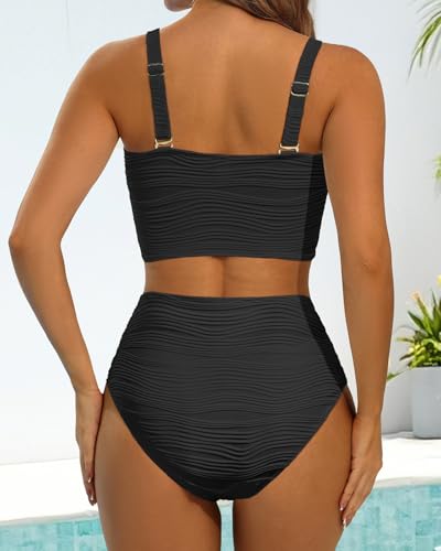 Women's Two Piece Bandeau Swimsuit Ribbed Strapless Tube Bikini Top with Mid Waist Cheeky Bottom Bathing Suit