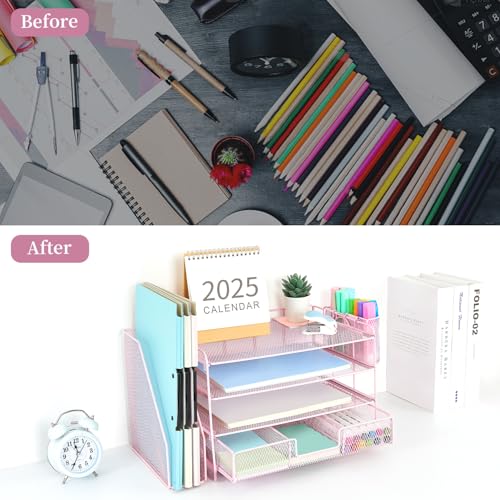 gianotter Paper Organizer with File Holder for Desk 4 Tier Letter Tray Office Desk Organizers and Accessories - Workspace Drawer 2 Pen Supplies (Pink) 4T-2
