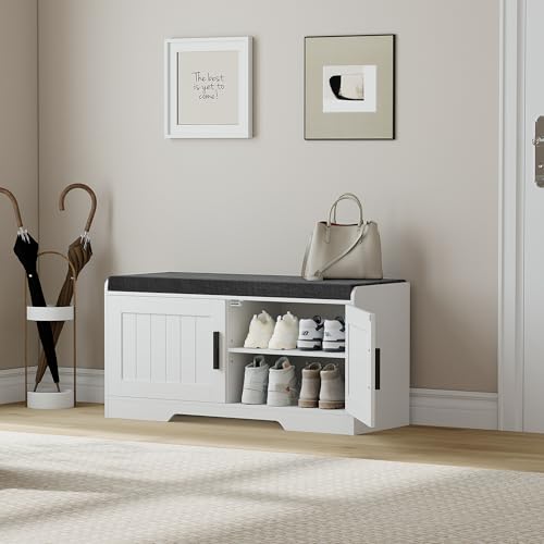 HOMEFORT 41.3\" Shoe Bench with Lift Top Storage Entryway Storage Bench with Cushioned Seat Wooden End of Bed Bench Shoe Cabinet Bench with Hidden Storage Space for Bedroom Hallway(White) Price in USA