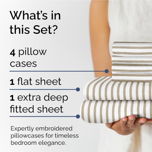 Why Choose This Product: If you're looking for a high-quality, comfortable, and luxurious bed sheet set that fits your deep pocket mattress, the CGK Unlimited Extra Deep Full Sheet Set is an excellent choice. With its breathable and cooling properties, soft wrinkle-free material, and easy fit design, this set provides a hotel luxury bed sheets set experience at a fraction of the cost. Currently on sale for $12.25, you can save 75% off the regular price of $48.99, making it an unbeatable value. Whether you have a large or extra tall mattress, this 6-piece breathable and cooling sheets set is perfect for you, and the beige striped sheet set will add a touch of elegance to your bedroom.
