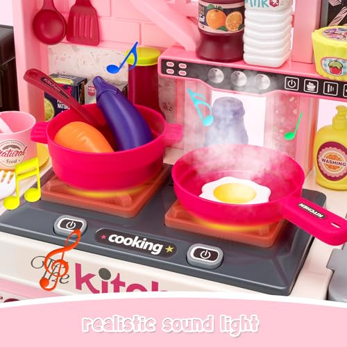 Pretend Play Girls Makeup Table Set with Stool,Open Doors by Gestures,Kids Vanity Set with Lights and Music,Toddler Beauty Salon Set with Makeup Accessories & Hair Dryer,Toy for Toddlers 2-5 Years Old