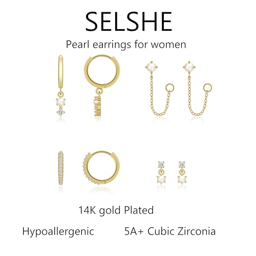 SELSHE Pearl Earrings for Women Dainty 14k Gold Plated Earri...