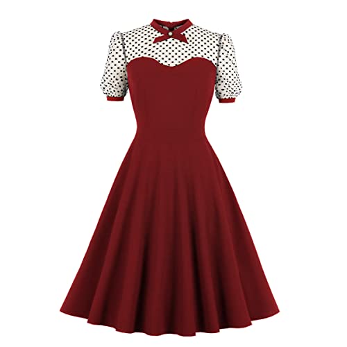 Women Mesh Sleeve Polka Dots Vintage 1950s Cocktail Swing Dr...
