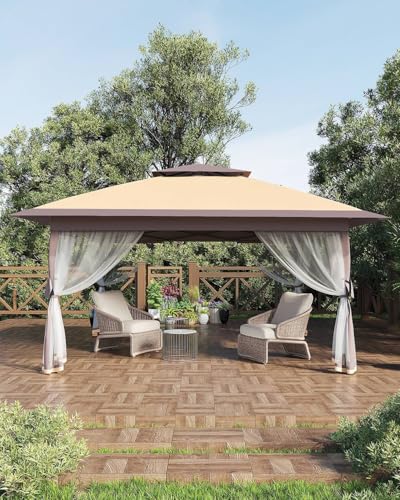 MELLCOM 12'x16' Hardtop Gazebo Galvanized Steel Metal Double Roof Aluminum Gazebo with Curtains and Netting Brown Permanent Pavilion Gazebo with Aluminum Frame for Patio Lawn & Garden Price in USA