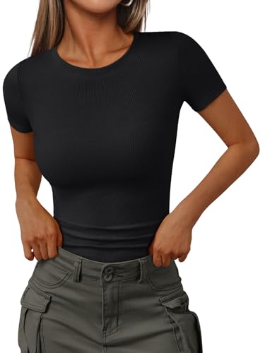 Trendy Queen Womens Short Sleeve Shirts Crewneck Ribbed Knit...