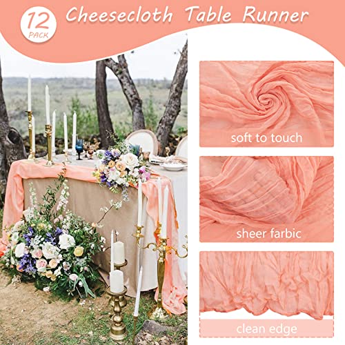Specifications & Details: Each 13ft cheesecloth table runner is approximately 35 x 157 inches in size, making it perfect for large tables. The peach coral color adds a warm and inviting touch to any event. With 12 pieces in a pack, you can use them to create a stunning rustic table runner effect or use them separately as decorative elements.