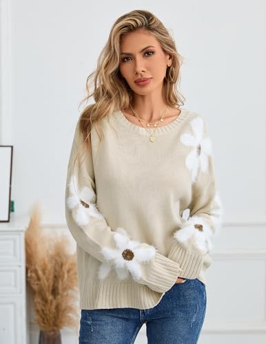 Womens Casual Cute Lightweight Ribbed Knit Crewneck Flower L...