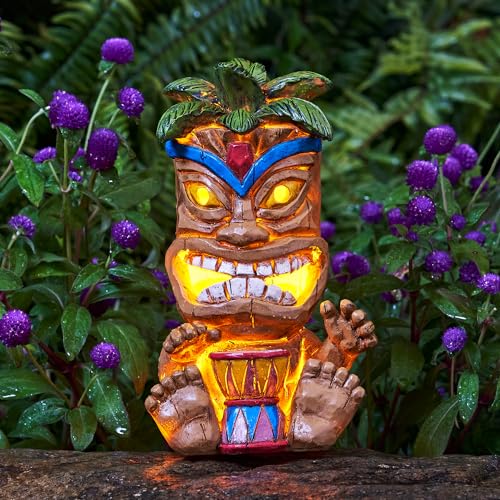 Add a whimsical touch to your garden decor with this Tiki Statue made of durable resin and designed for outdoor use. The intricate details on this unique figurine are sure to impress This tiki man statue is a flamingo knight tiki eye that emits a warm and bright glow after the sunset.