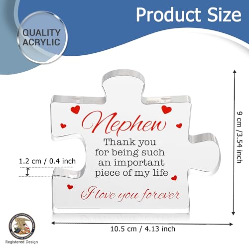 Emotional Thank You Gift Will Make Your Nephew Smile! Looking for a heartwarming nephew graduation or promotion gift? Are you in search of creative gifts for nephew from aunt or uncle? Presenting The VELENTI Acrylic Puzzle Nephew Present! An acrylic puzzle with an engraved message is a combination of artistic beauty and emotional depth capturing the essence of your relationship with your nephew. The VELENTI acrylic puzzle gift combines the elegance of acrylic with a personalized touch making it a timeless keepsake that your nephew will cherish for years. Thanks to its transparent material this nephew present can add a touch of contemporary elegance to any space. Why Choose Our Mens Gift? Here Are The Top 3 Reasons! ✅ UNIQUE KID AND YOUNG ADULT GIFTS: No more nephew graduation card gifts cups and nephew t shirts that all look the same. Elevate your gift game with a personalized nephew appreciation gift. ✅ MEANIGFUL GIFTS