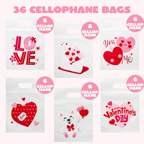 JOYIN 36 Pcs Valentine's Day Cellophane Gift Bag Candy Treat Bag with 6 Valentine’s Themed Designs for Kids Party Favor Supplies Valentine’s Goody Bag Classroom Exchange Prizes SUPER VALUE PACK: Our Cellophane Gift Bags set includes 36 pieces of Cellophane Candy Bags featuring 6 different designs. With dimensions of 6.5*6.5 inches these Cellophane Gift Bags for various treats toys or party favors catering to the needs of both kids and adults. ADORABLE DESIGNS: The cellphone bags have unique designs of attractive decorations patterned with balloons bear various hearts and love colored in bright and vivid pink. Our cellophane bags are quite romantic and sweet suitable for Valentine's Day party supplies. IDEAL FAVOR: Fill these bags with candies or small toys!Great for Valentine Party Favors Set provides fun and entertainment for your kids! It’s a great gift option for kids’ school classroom prizes gift exchange love notes and more!This is also a great bag for