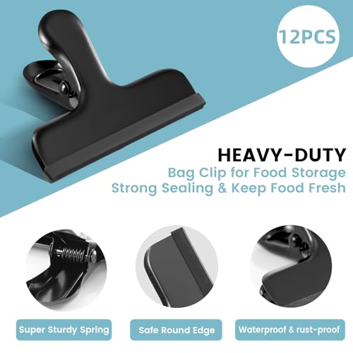 HOUSE AGAIN 12 Pack Stainless Steel Chip Bag Clips Covered with Silicone - NO More Sharp Edges - Color Coded for Food Bags - Air Tight Seal Heavy Duty for Kitchen and Office 3 Inches Wide Black