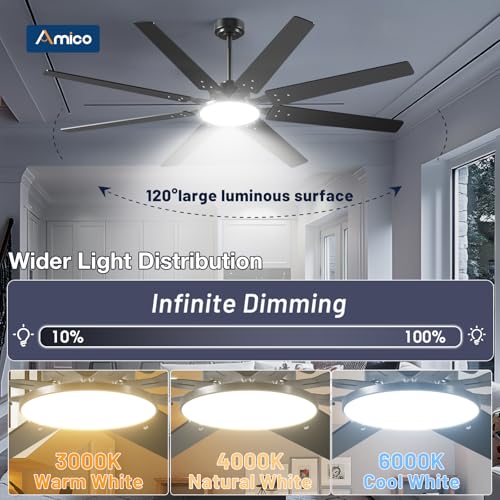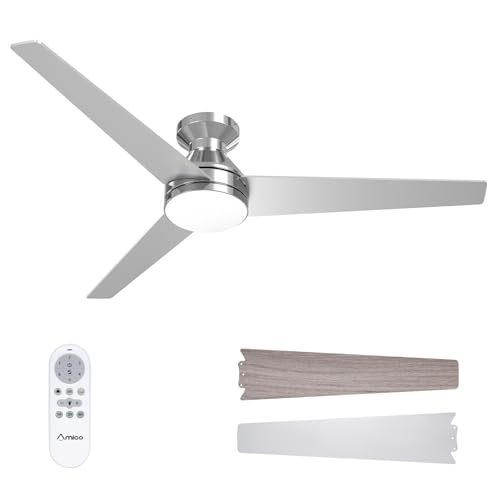 Amico Ceiling Fans with Lights 52 inch Low Profile Ceiling fan with Light and Remote Control Flush Mount Reversible 3CCT Dimmable Noiseless Nickel Ceiling Fan for Bedroom Indoor/Outdoor Use