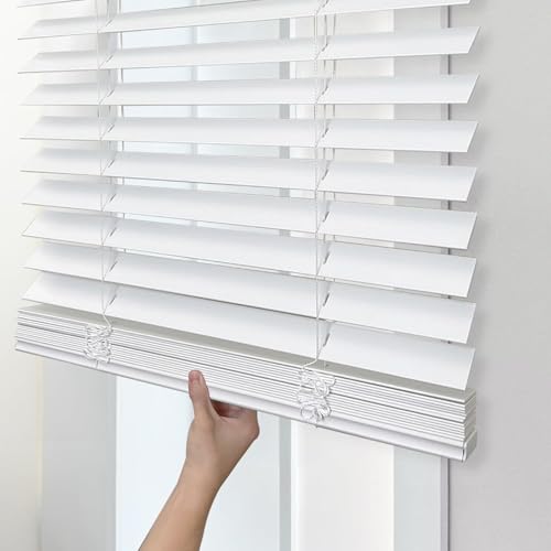 Specifications & Details: The DEZ FURNISHINGS 2" Cordless Faux Wood Blind measures 27.5" in width and 48" in height, with the actual width arriving ½" narrower for a snug fit inside your window frame, allowing for end caps and hardware. This product is designed for both inside and outside mounts, offering versatility in installation. Made from high-quality PVC faux wood, these blinds are not only durable but also easy to maintain and resistant to moisture.