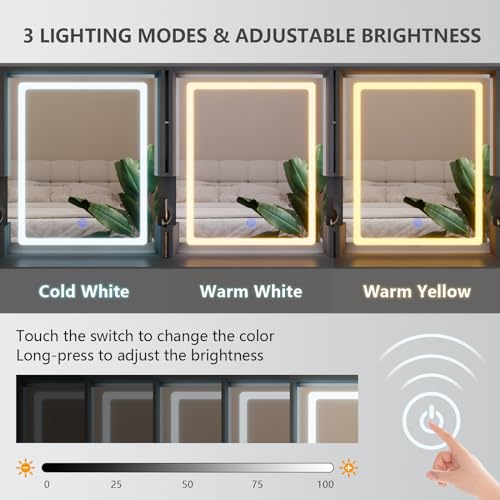 Vanity desk with charging station Large mirror with Lights 3 Lights mode and brightness adjusted by touch button 4 cabinets including 2 RGB cabinets 1+1+4 drawers
