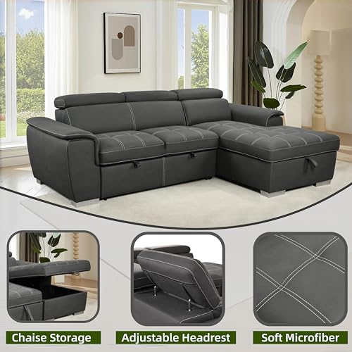 Elevate your living room to new heights of style and comfort with our THSUPER 102'' Sectional Sleeper Sofa. This luxurious L-shaped couch boasts a pull-out bed and storage chaise lounge so that you can customize it to your heart's content. With adjustable headrests the THSUPER sofa will provide you and your guests with the ultimate support and relaxation. The microfiber upholstery of this stunning sofa set is not only stylish and durable but also adds a soft touch that invites you to sit and unwind. Its ample seating makes it the perfect choice for entertaining both family and friends. You can effortlessly stretch out and relax while watching TV or reading a book thanks to the attached cushioned legs. When guests stay over simply pull out the sleeping area from the THSUPER 102'' Sectional Sleeper Sofa for a comfortable and cozy sleeping experience. Its versatile design is matched with a contemporary style making it an ideal addition to your living room. Furthermore the neutral co