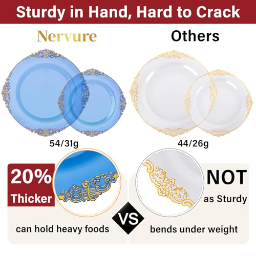 Nervure 350PCS Blue Plastic Plates - Blue Plastic Dinnerware Sets for 50 Guests - 100 Blue Disposable Plates 150 Gold Plastic Silverware 50 Cups 50 Napkins for Wedding & Party