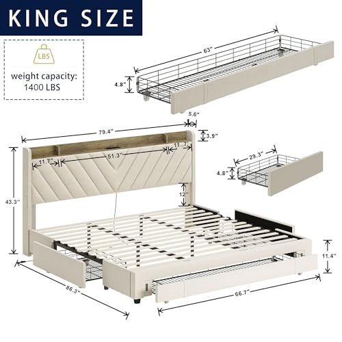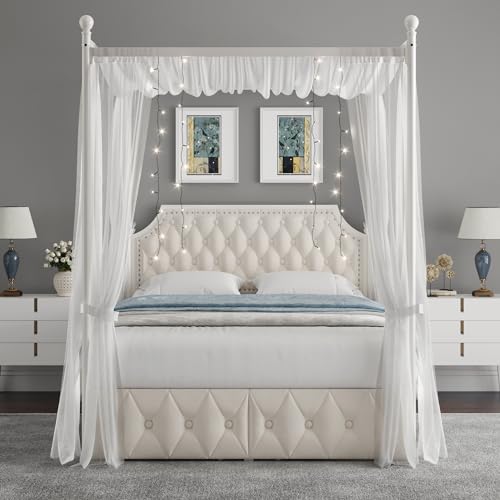 Keyluv Queen Upholstered Canopy Bed Frame with 2 Drawers and...