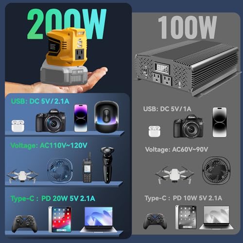 200W Portable Power Inverter for DeWALT 20V Ecarke Outdoor Generato Battery Converter with 2 USB&LED&AC Battery Powered Outlet Convert DC 18V/20V to AC 110V-120V Portable Power Station(Tool Only) Price in USA