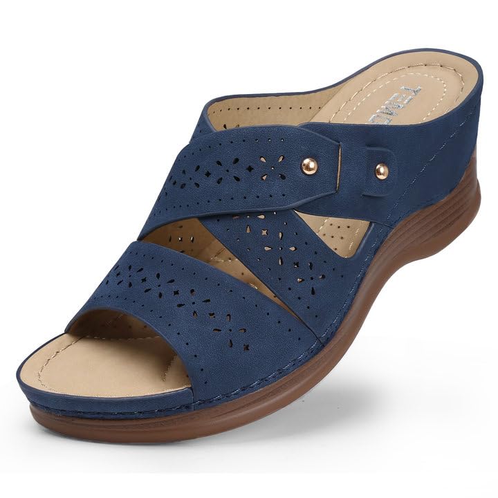 TEMOFON Women Wedge Sandals Dressy: Navy Blue Low Heels Platform Sandal Size 8 Woman Wedge Slip on Wide Width Sandals Womens Casual Comfort Summer Shoes Leather Price in USA