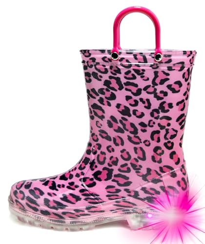 HugRain Toddler Girls Rain Boots Little Kids Baby child Light Up Waterproof Rubber Shoes Leopard Printed Mud Lightweight Adorable with Easy-On Handles Non Slip Sole Pink Size 8