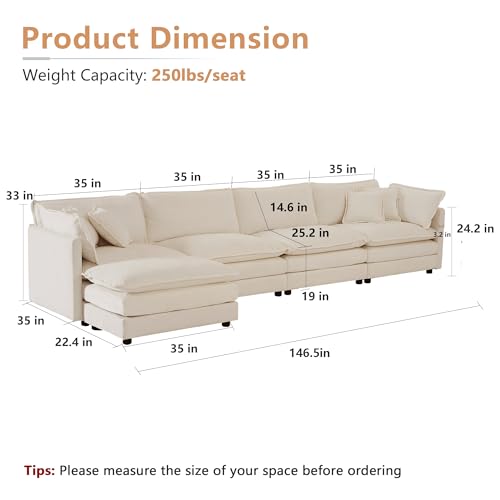 mikibama Modular Sectional Sofa 146.5 Inch L Shaped Couch Set for Living Room 4-Seater Comfy Cloud Couches with Movable Ottoman DIY Combination Chenille Light Coffee Price in USA