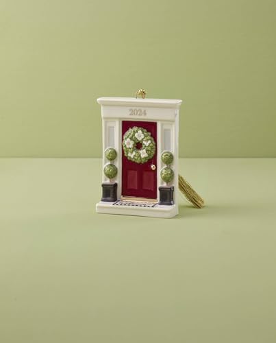 Welcome home the holidays! Hang this front door ornament on the Christmas tree of your new home. Featuring a festive and bright entrance with a lush wreath blooming with lovely flowers. \"2024\" is inscribed in gold above the entryway.