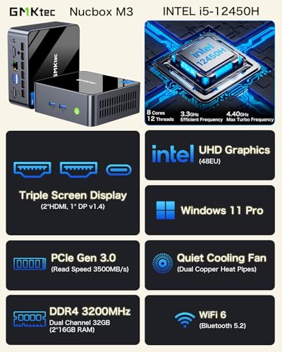 Why Choose GMKtec Mini PC? The mini pc all-in-one computer will transform your life! Our small gaming computer takes up less space and the fast processor loads up software and application in seconds! Perfect pc for casual gaming work study office business htpc and server use. Specifications Model: AMD Ryzen 7 5825U CPU: AMD Ryzen 7 5825U( 8C/16T Up to 4.5GHz L2 4MB L3 8MB Cache) Processor Graphics: AMD Radeon Graphics 8 Cores 2000 MHz RAM: 32GB DDR4 Dual Channel (16*2) Storage: 1TB Ethernet: DUAL LAN 2500Mbps*2 RJ45 WiFi: WiFi 6E (2.4GHz/5.0GHz/6.0GHz) Bluetooth: BT5.2 Expand Storage: 2*M.2 2280 PCIe SSD NVME (Max. 4TB) Small Form Factor PC: 5.07*5.00*1.88 inch Weight: 1.10 lbs Ports: 1* DC Jack Port 2* USB 3.2 Port 2* USB 2.0 Port 2* RJ45 (2500Mbps LAN) Port 1* HDMI 2.0 Port 1* USB-C (PD/DP/DATA) Port 1* DP Port 1* 3.5mm Audio Jack (HP&MIC) Port