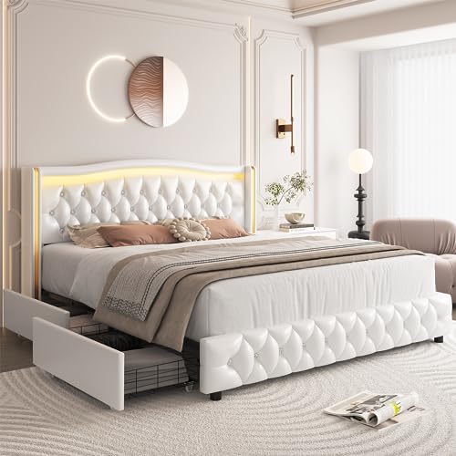 DIYSET King Size Bed Frame with Headboard Upholstered Platform Bedframe with 3 Underbed Storage Drawers AC USB & Type C Charge Station Wooden Support Slats No Box Spring Needed Easy Assembly Beige