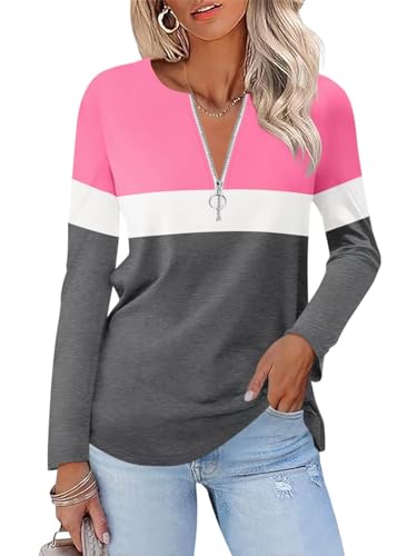 ORANDESIGNE Women's Long Sleeve Shirts Color Block Zipper Tops Tunics Casual Fall Ladies Tees X-Large Pink-white-grey Price in USA