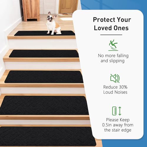 PATTENGO Non Slip Stair Treads for Wooden Steps 15 Pack 8\"\" X 30\"\" Stairs Carpet Treads Indoor with Reusable Peel and Stick Adhesive for Kids Elders and Pets Polyester TPR Backing Black