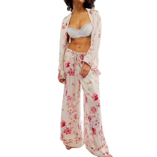 Fenghualzzniya Women Satin Pajama Set Floral Silk Pajamas 2 Piece Lounge Sets Button Down Shirts Wide Leg Pants Pjs Sleepwear White Medium Price in USA