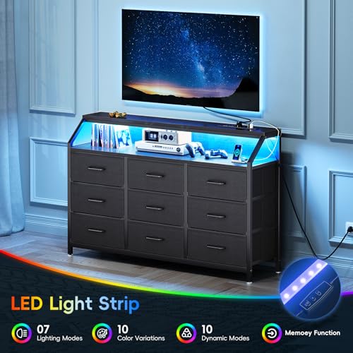 KKL 55"" Wide 9-Drawer Dresser for Bedroom with LED Lights a...