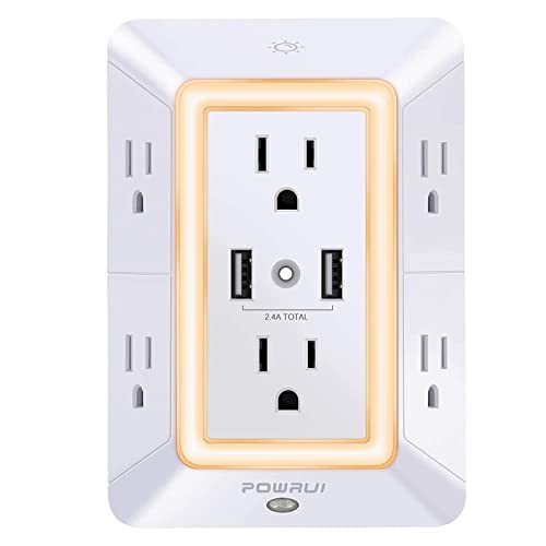USB Wall Charger Surge Protector POWRUI 6-Outlet Extender with 2 USB Charging Ports (2.4A Total) and Night Light 3-Sided Power Strip with Adapter Spaced Outlets - White,ETL Listed Black Price in USA