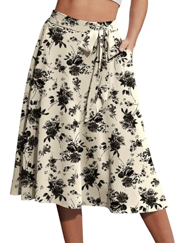 MLXSJ Women's Midi Skirt Summer Pleated Flowy Elastic High Waisted Skirts with Pockets (Black Floral Light Beige L) Large Price in USA