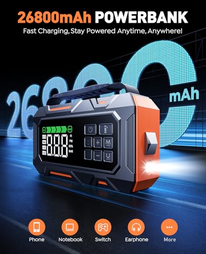 portable jump starter car battery jump starter battery pack car battery charger jump starter portable car jump starter car jumper starter portable battery jumper starter portable Battery jump box for vehicles car jumper car starter jump pack booster Jump starter with latest QDSP technology easier to start dead heavy-duty vehicles than its counterparts. 25-cylinder digital tire inflator features maximum pressure of 150 PSI and efficiency of 35L/Min takes about 1 min to refill tires in daily situation (25-36PSI) and can inflate up to 10Kg tires. Smart preset & auto shut-off without repeated adjustment and check wide applications and no overinflation. Portable fast charge power bank with 2 smart USB ports allows you to charge your smartphones tablets and other electronic devices at the same time. Bright LED flashlight with 3 modes (Flashlight SOS and Strobe) to help camping and be ready for any underestimated emergency cases. Defy extreme temperatures of -20℃~60℃ so no more worrying