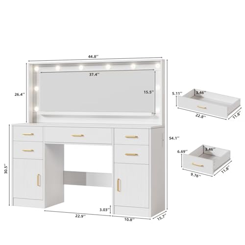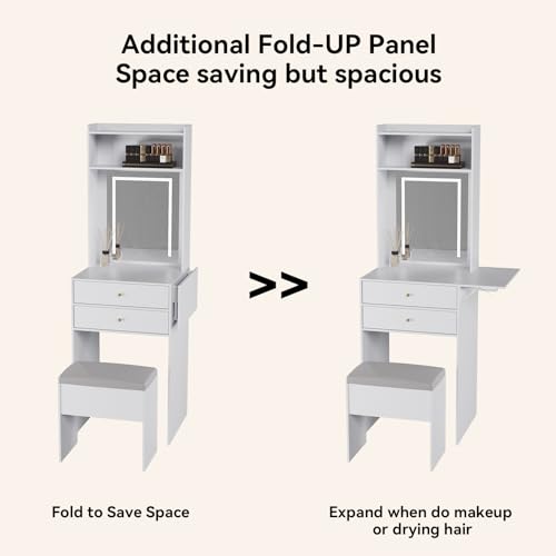 ARTETHYS Small Vanity Desk Set with Flip-top Mirror and Lights White Integrated Makeup Table for Small Space Compact Mini Dressing Table with Fold-up Panel and Storage Chair for Bedroom