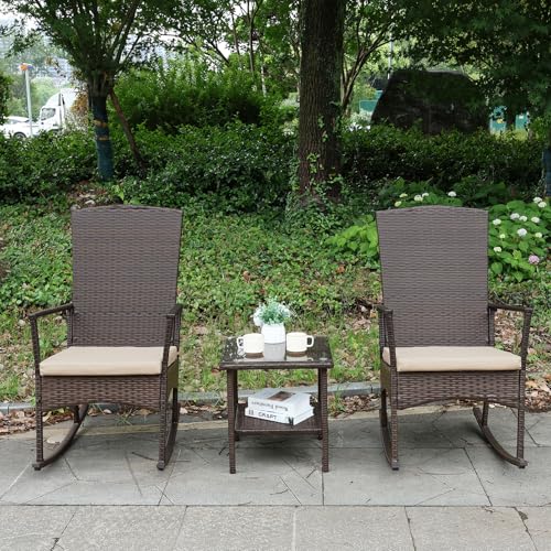 Villeston papasan rocking chair the frame is made of coated steel and rattan material with rust-proof function white thick cushion with stain-proof water-proof and uv-proof function 350lbs load capacity can be used indoors and outdoors suitable for front porch lounge lawn bedroom gardens decks poolside living rooms study room scenes.