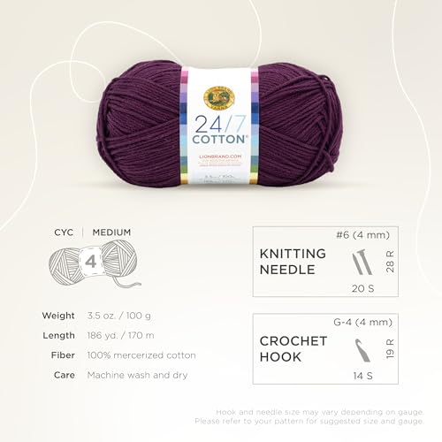 Product Overview: The Lion Brand 24/7 Cotton Yarn is a high-quality, worsted-weight yarn designed for knitting, crocheting, and various crafts. As part of the HOME > YARN category, this product stands out for its supersoft texture and rich, vibrant colors, including the beautiful Eggplant hue. Lion Brand, a renowned brand in the yarn industry, offers this lightweight yarn made from 100% mercerized cotton, ideal for creating intricate stitching patterns and eye-catching projects such as scarves, blankets, and sweaters.