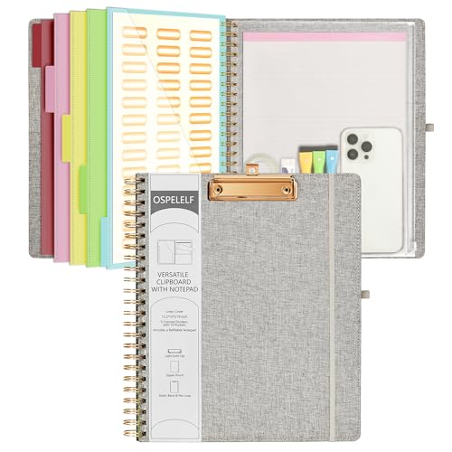 Ospelelf Green Foldable Spiral Clipboard Folio with Storage Zipper Pouch 5 Plastic Folders with 10 Pockets Refillable Lined Notepad (11\" x 8.5\") Linen Hardcover Project Organizer Price in USA