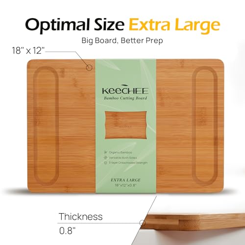 Introducing the Keechee Extra Large Bamboo Wood Cutting Board for Kitchen a versatile and durable addition to your culinary arsenal. This cutting boards comes in extra large sizes to suit all your chopping needs. The boards measure 18\" x 12\" x 0.8\" providing ample space for various food prep tasks. Crafted from bamboo these cutting boards are not only eco-friendly but also offer a slew of benefits. Bamboo is known for its natural beauty making these boards an elegant addition to your kitchen decor. The Keechee Bamboo Wood Cutting Board is designed with the modern home chef in mind. Each board features juice grooves to catch excess liquid keeping your workspace clean and tidy. The built-in handles allow for easy transport from counter to table while the knife-friendly surfaces ensure that your blades stay sharp. These boards are not just limited to cutting tasks; their back sided can also double as serving platters or cheese boards adding