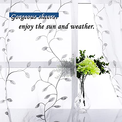 AmHoo 2 Panels Embroidered Leaf Pattern Semi Sheer Curtains Foliage Floral Voile Window Draperies Treatment for Bedroom Living Room Rod Pocket White Sage Green 53 x 84 Inch AMX1029-20-2