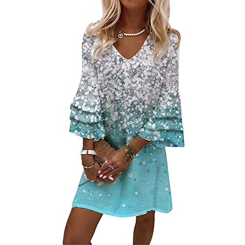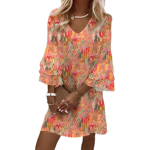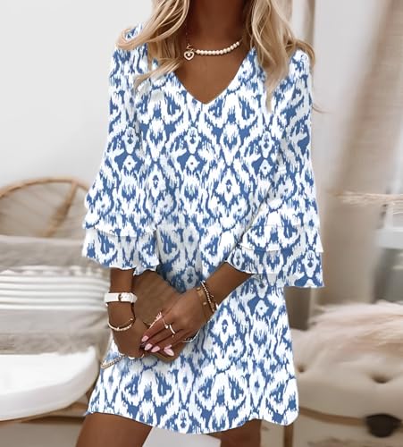 Women's Casual Boho Floral Print Dress Loose V Neck 3/4 Wave Bell Sleeve Flowy Mini Beach Summer Dresses for Women Price in USA