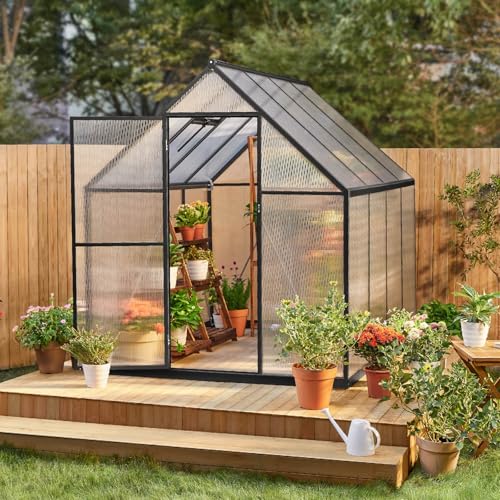 Greenhouse for Outdoors 8x14 FT Polycarbonate Greenhouse with Roof Vent and Quick Setup Structure Aluminum Large Walk-in Greenhouse for Outside Garden Backyard Black Features: Tested over 500 times our greenhouses are designed for simplicity with a quick-fit system and slide-in panels that are 40% faster to install and 35% more stable. Our conservatories have lockable doors and ventilation windows for air circulation and enhanced security. Our greenhouses can withstand all kinds of wind and rain and can provide protection for your plants by allowing them to grow in a stable and long-lasting environment. VIWAT greenhouses are equipped with panels with UV-coated surfaces while maximizing sunlight exposure an optimal balance that contributes to healthy plant growth. Material: Metal