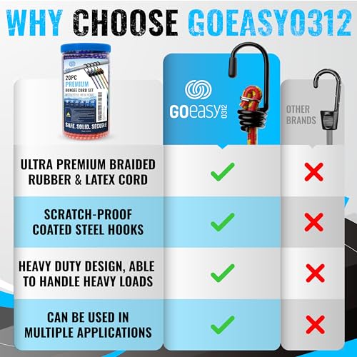 Elevate your outdoor and cargo securing needs with a set of Bungee Cords Heavy Duty Outdoor featuring 20 premium rubber bungee cords with hooks. UV-resistant and built to last these cords excel in tough conditions. Featuring a natural latex core for superior elasticity they provide reliable tension. With sizes from 10"" to 48"" and color-coded for easy selection these heavy-duty bungee cords with hooks are versatile and neatly stored in a compact jar.