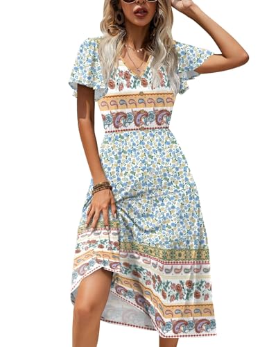 Zeagoo Women's Flutter Sleeve Smocked Midi Dress V Neck Casu...