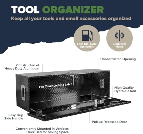 Whether you're on the road or in the garage this versatile storage chest ensures your tools and accessories are always secure and neatly organized. Built tough to withstand any environment it’s perfect for keeping everything in order whether in your truck bed or at home. Its sleek rectangular shape and low profile are great for smaller spaces. The durable aluminum construction with a diamond tread pattern makes this a rigid toolbox that can stand up to rugged and long-lasting use. It’s also corrosion and rust-resistant and features a lid with an over-hanging lip. This prevents water or moisture from seeping through ensuring your tools stay dry. A built-in lock ensures greater security. Fold-up doors provide full access to the contents so you can retrieve or place items quickly and easily. Two side handles offer easy portability This toolbox measures 48.42\"(L) x 15\"(W) x 15\"(H) and the package includes one 49\" aluminum toolbox and two keys.