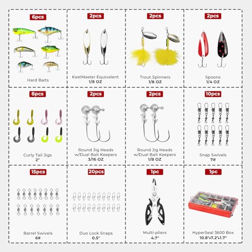 TRUSCEND 203pcs Fishing Gear Kit is a reliable and comprehensive choice for beginner or experienced anglers in any season and any water. Whether you're into bass trout fishing or other freshwater fishing these multi-species fishing accessory kits include all of the fishing tackle you need to catch a variety of fish. Most of fishing accessories are made of stainless steel which is not easy to deform and has strong corrosion resistance in the sea and they also feature an exceptional strength and precision craftsmanship that will help you effortlessly catch more fish without worrying about losing them! With freely removed and combined dividers inside our excellent easy-to-pack stowaway case is suitable for all of your lures and fishing tools and fits in your fishing seat box fishing backpack and fishing vest's pocket portable size and weight for take it around and enjoy fishing anywhere.